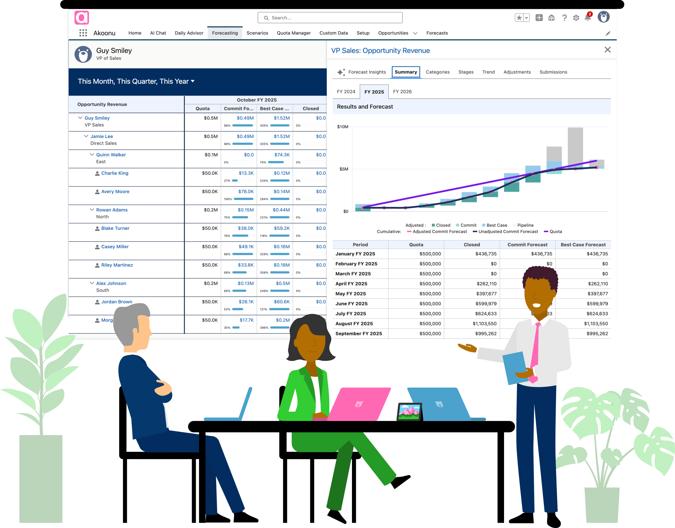 Forecasts Overlay by Akoonu transforms Salesforce Forecasts with a suite of intelligent tools that boost accuracy, efficiency, and clarity. Get rapid insights, built-in sales methodology support, operational efficiencies, and delightful user experiences.