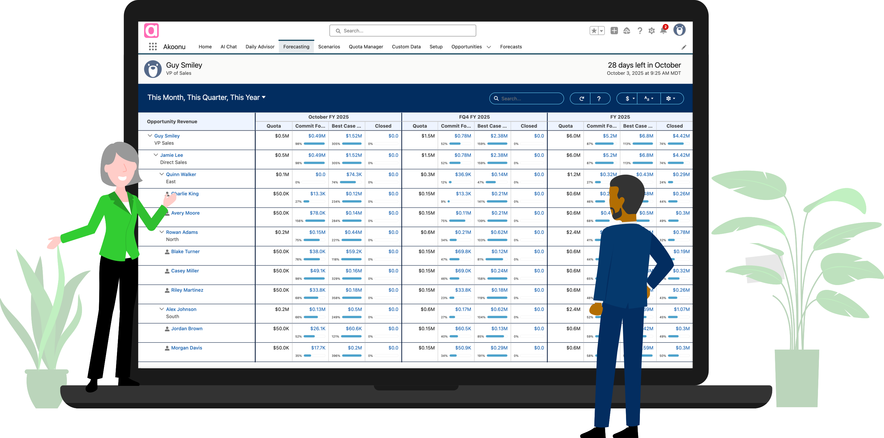 Akoonu Overlay Apps seamlessly rides on top of your Salesforce setup, including Forecast Types, and Team Hierarchies. You will be up and running in minutes.